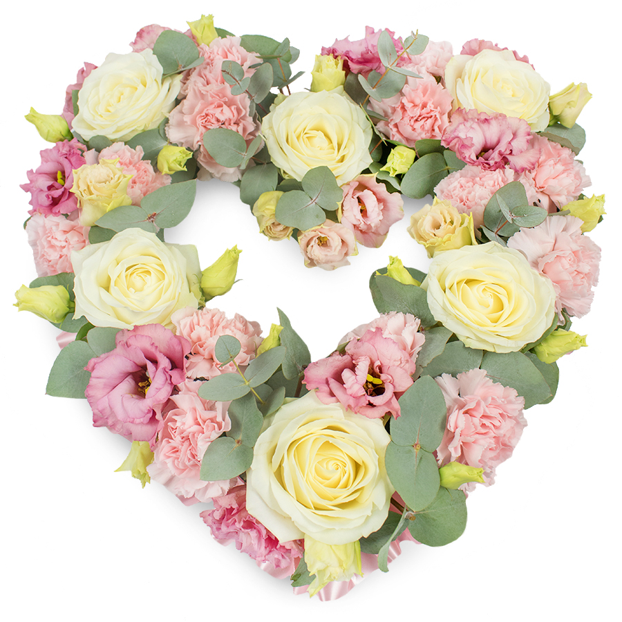 Express your deepest sentiments with our Elegant Heartfelt Tribute Floral Arrangement. This beautiful bouquet features a delicate combination of white roses, pink carnations, pink lisianthus, and eucalyptus leaves, artfully arranged in an open heart shape to symbolize love and remembrance.