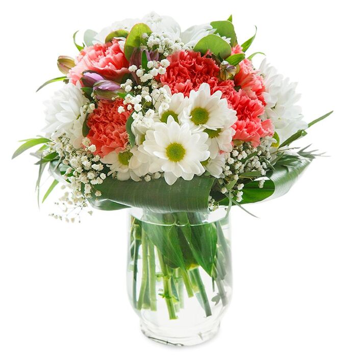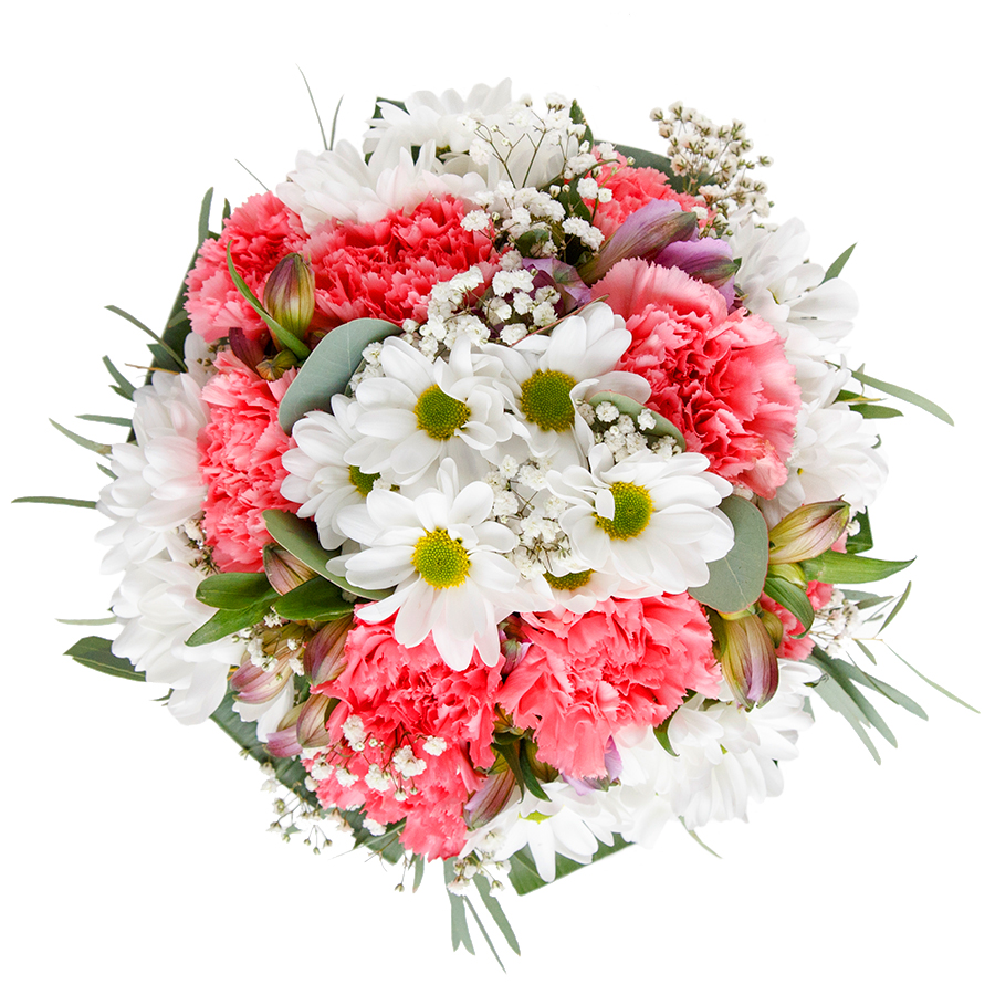 Express your affection with our lovely and unique flower bouquet. This exquisite arrangement features snow-white chrysanthemums, delicate gypsophila, and soft pink carnations, beautifully arranged with vibrant aspidistra leaves.